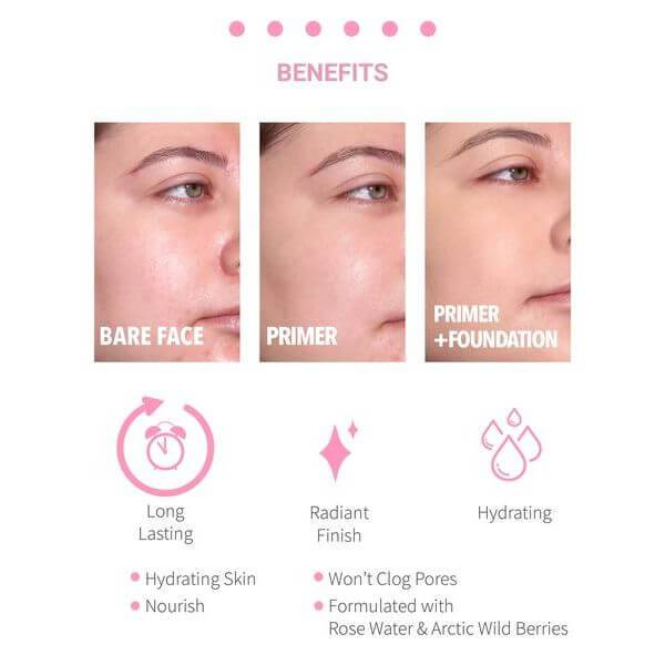 MOIRA Rose Jelly Hydrating Primer is a primer with a refreshing jelly-like texture gel formula containing Rose Water and Arctic Wild Berries Extract that helps restore and hydrate the skin. For optimal results, allow the formula to set for one minute to fully absorb and activate grip for a smoother application that lasts all day, or wear alone for a fresh, hydrated, and glassy skin.
